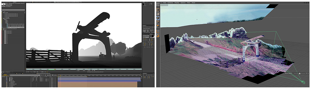 Image Set: Creating the Hacienda Nápoles entrance shot in Adobe After Effects (left) and Maxon Cinema 4D (right)