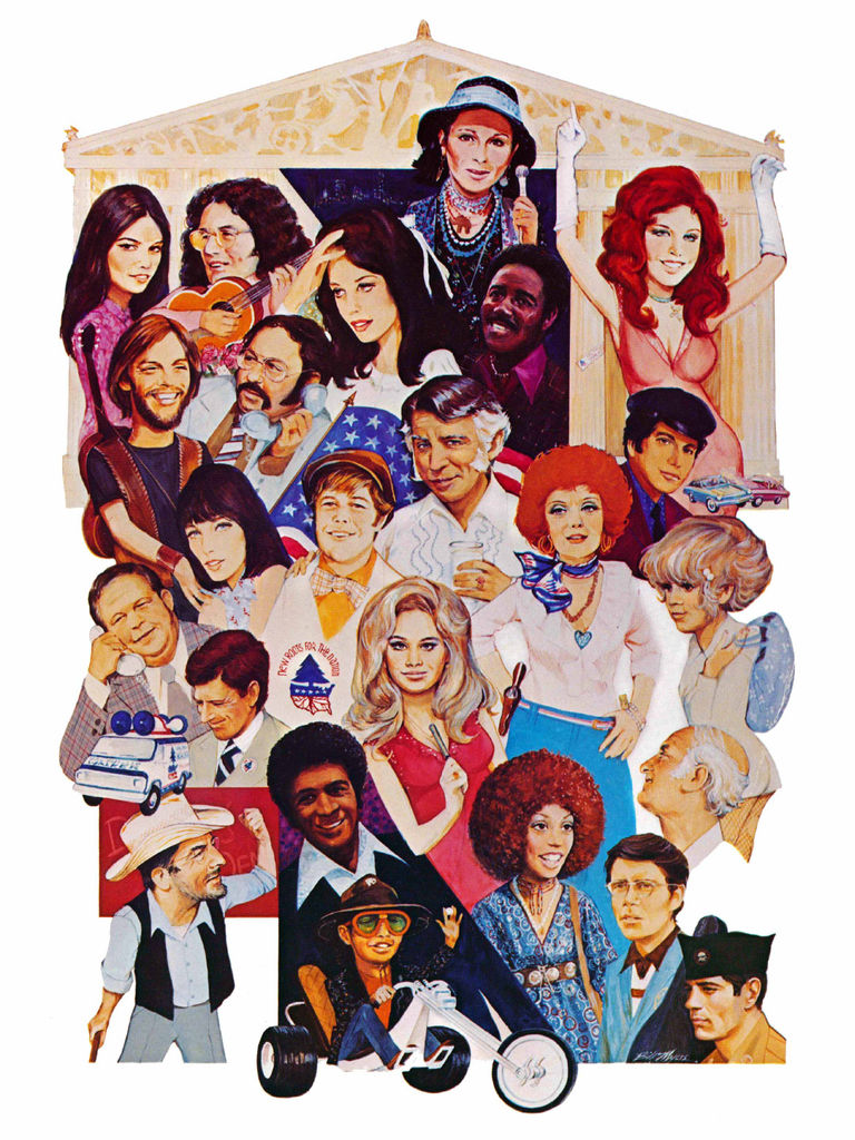 Bill: I was on the set every day and I noticed that the costuming was all in reds, whites, and blues. I knew immediately that this was Bob Altman’s Bicentennial movie – this was really about America not just about Nashville. It’s his paean to America. So the way I constructed this – it was 30″ x 40″, a big gouache painting – I put all the characters equal size, all 24 characters, and put them in connective relation to each other. Each head size is equal to the other and no one person dominates. But the way I laid it out, I had the trio up in the upper left hand corner, I had the manager and the singer, the politicians lower down, you see that each one is related to the next character, except for Bert Remsen who is chasing his wife all over the place. She is across the illustration. You’ll also notice that the main colours are red, white, and blue, and it really worked well.