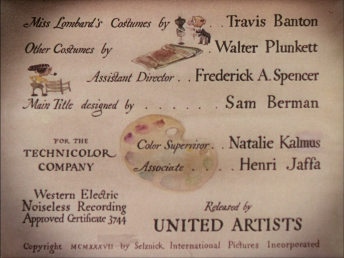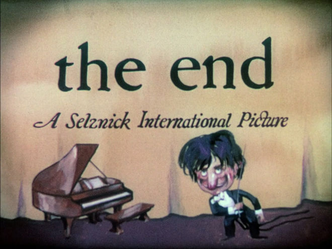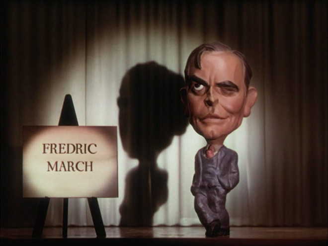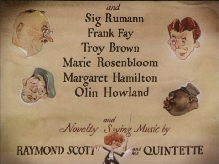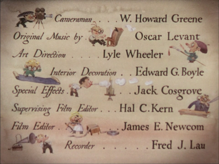 The remaining title cards list the rest of the cast and crew, embellished with illustrations of the production crew – likely artist’s renditions rather than straight caricatures as evidenced by the credit for composer Oscar Levant, whose bespectacled cartoon counterpart looks nothing like his distinctive hang-dog face.
