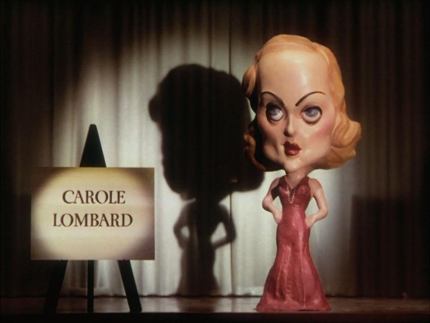 But it is also the only film credit of Sam Berman, celebrity caricaturist and the film’s title designer. Berman’s work here is immediately eye-catching. The first frame begins incongruously enough, with an in-camera shot of a hand-painted title card propped up on a small easel, informing us that Nothing Sacred is a Selznick production. That card is flicked aside and another one set in its place, emblazoned with Lombard’s name. Suddenly, the camera pulls back to reveal a sculpture of Lombard standing next to the card; a caricature that is nearly grotesque in its exaggeration of the actress’s high forehead, sharp cheekbones, and pencil-thin arched eyebrows. The camera pans over to another sculpture, this time of the squared jaw and cleft chin of Fredric March. Supporting players Charles Winninger and Walter Connolly each get their own caricatured figures, their bodies accentuated and made rotund.