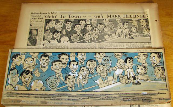 Curiously, Berman’s own credit is unaccompanied by an illustrated figure, which is an unexpectedly appropriate metaphor for the relative lack of coverage on the artist’s career, though he was as much a celebrated caricaturist as contemporaries like Al Hirschfeld. Berman began his career as a newspaper cartoonist, his most notable gig being the go-to illustrator for the popular New York Daily Mirror column “Goin’ to Town” by Mark Hellinger which ran from 1936 to 1937.