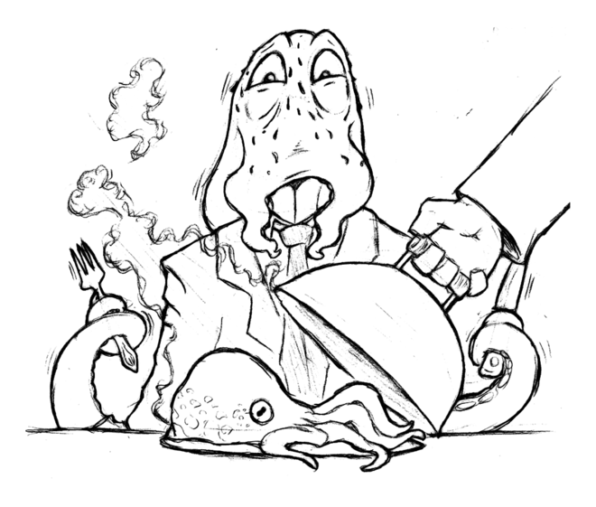 KZ: Right, in the original pitch it was an octopus in a robot human suit, but when they brought it to the larger group we decided it would be funnier if he were just an octopus.