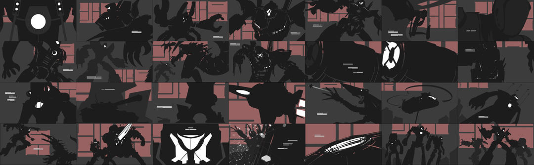 Other concepts included taking the 3D models and sketch-rendering them as if they were technical drawings. These were accompanied by line tracings of the schematics we received as well as a graphics toolkit designed by Jae Namkung, our intern. Additionally, we worked with My Tran, an illustrator who hand-crafted looks for a couple other directions; one imagined how Kaiju war propaganda posters would look while the other was an homage to manga.