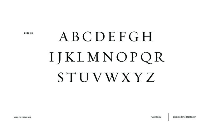Main title sequence iteration 1, featuring the final title "Panic Room" in the Copperplate typeface in capitals and small caps, September 2001