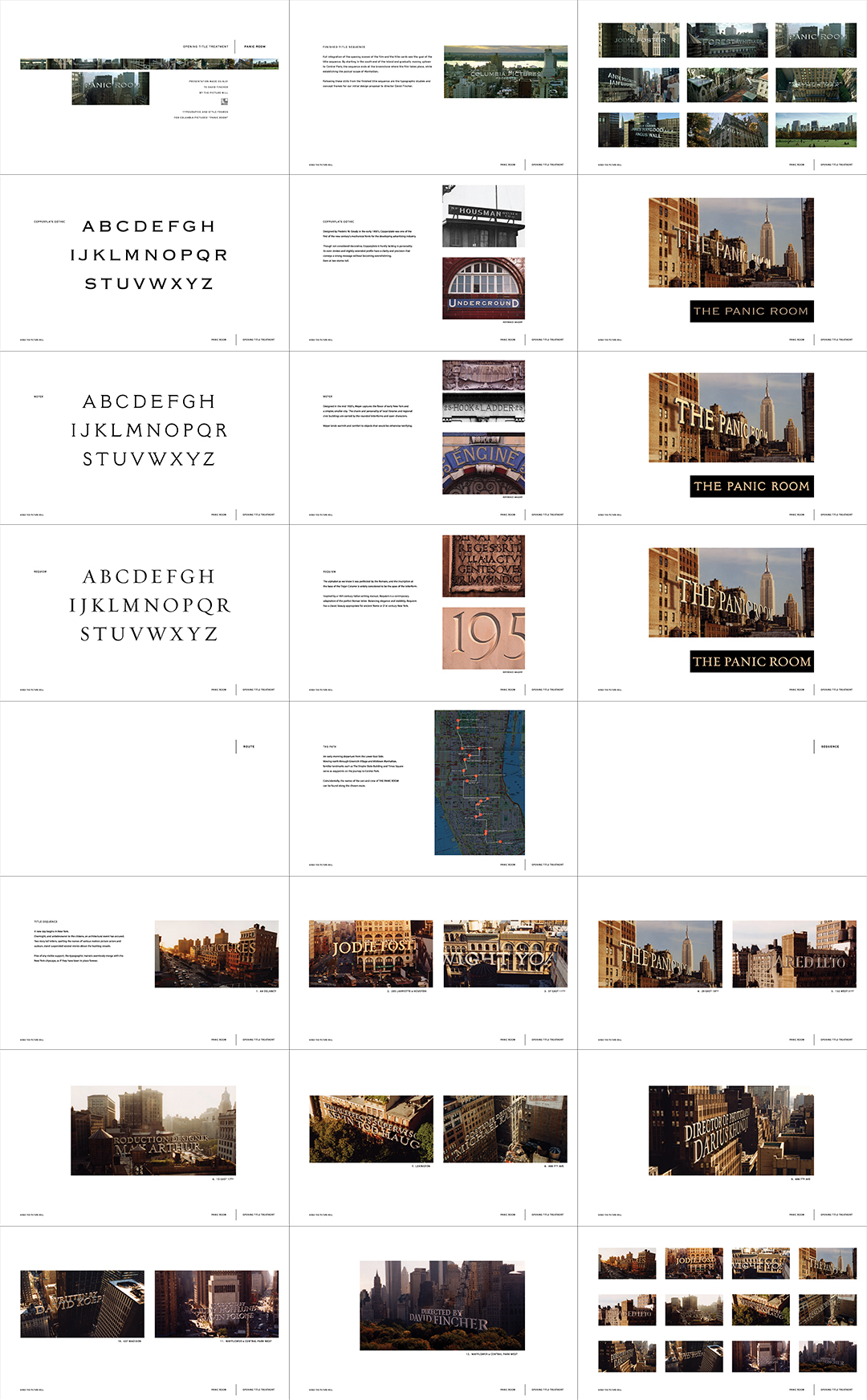 Picture Mill's presentation book for the opening of The Panic Room – as it was then called – featuring concept images of modeled 3D typography painted into location stills, examples of typography in New York City, and a map with a proposed path from the south of Manhattan to Central Park.