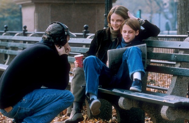 David Fincher (left) directs Jodie Foster and Kristen Stewart for an outdoor scene of Panic Room.