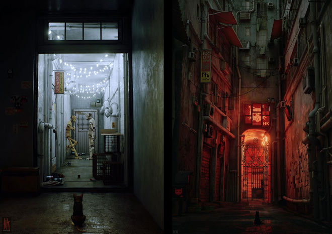 There were two main things which had a great effect on the direction of the sequence after I went into production. First, the game HK which give me the cat idea. Second, a short film called None directed by Ash Thorp and Chris Bjerre.