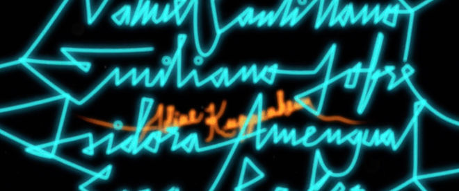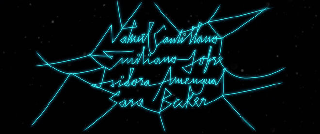 Pablo: Very important in the concept of the neon strings was that double-cross the community had as a symbol. I wanted to use something that felt like neon but not exactly that. The end of the movie is dark as night. That was an important starting point. We couldn’t make too drastic a change. It was really about light. The whole conversation of the title sequence is about light. Light and darkness. That fight. The initial idea was that we would see a transit from night to day in the ending sequence. The neon strings would lose brightness. In the end we just made a contrasting card for Sara Caballero, the star actress, by using the spark.