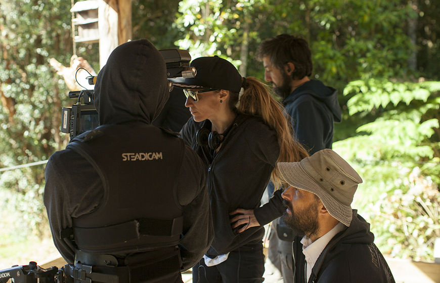 Director Marialy Rivas (center, with headphones) on the set of Princesita (2018)