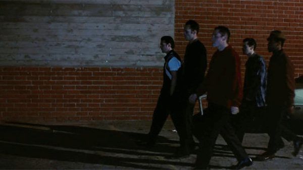 As the besuited band of men strolls down an alley, each actor is introduced in a mustard serif typeface and the George Baker Selection’s 1970 hit “Little Green Bag” pulses upbeat. The sequence, originally filmed in 24fps and stepped down to an almost-jumpy 12fps, achieves a sort of snappy grace. Slowly, the title sweeps up into the frame and the men get smaller in the distance as K-Billy's Super Sounds of the Seventies Weekend just keeps on truckin'.