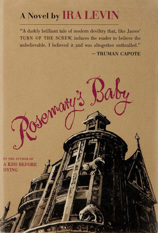 The style of typography used in the opening of Rosemary’s Baby is pulled directly from the first edition of the book, which also featured tightly curled lettering set against an ominous building.