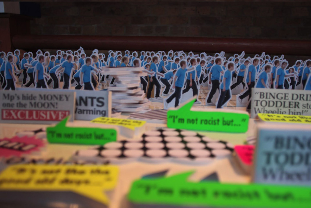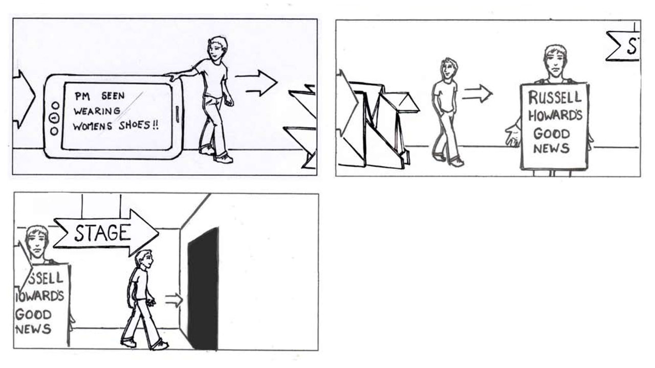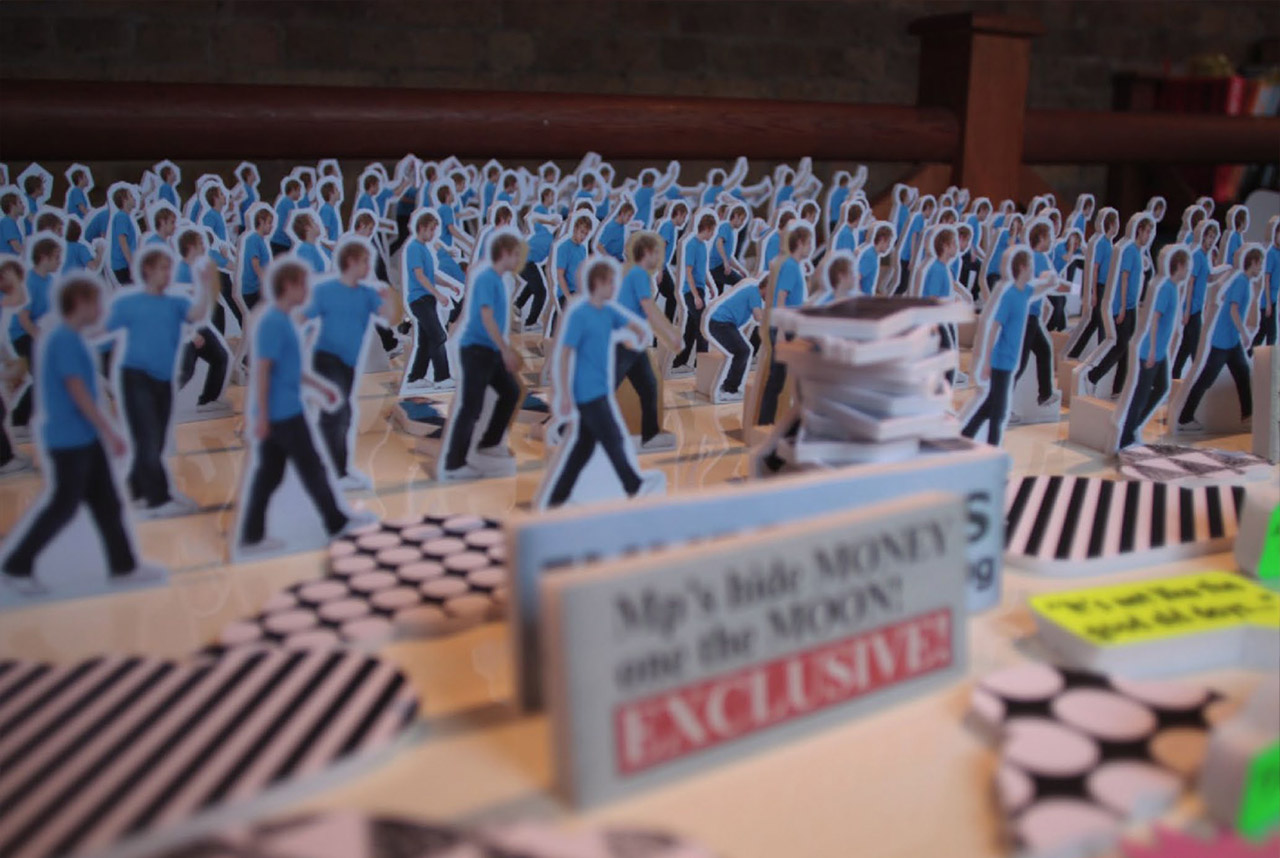 We shot one sequence with Russell in an empty white studio. Designed and printed out other elements (speech bubbles, logo sandwich board, arrows, newspapers etc) along with the selected stills of the shoot with Russell. Mounted it all up onto foam board. Rented some props, some lights and lenses. Made a tabletop white cove with some white formica. Shot it over a non-stop period of 2 days. We then took the rushes into After Effects and tidied them up, tweaked colours and levels. Got a rough cut signed off by the client. Began the lengthly task of retouching and incorporating additional CGI props. Composited it altogether. Gave it all a final grade.