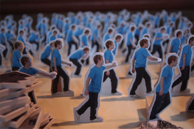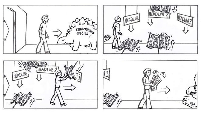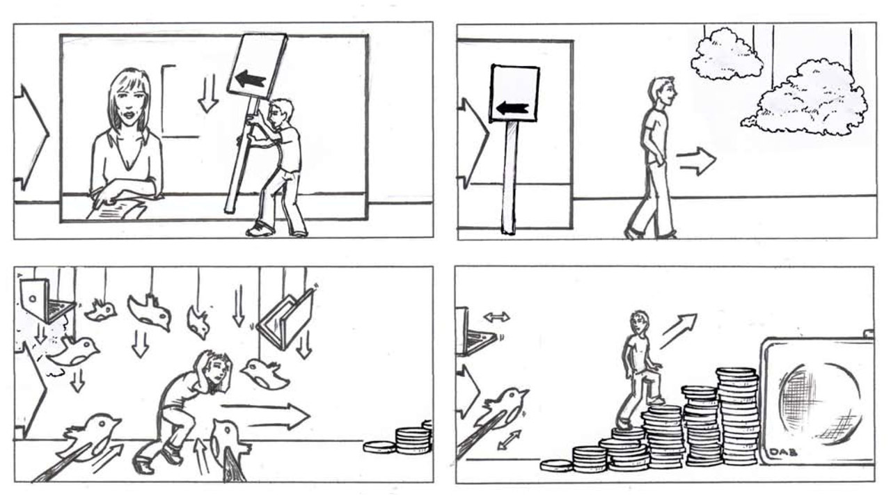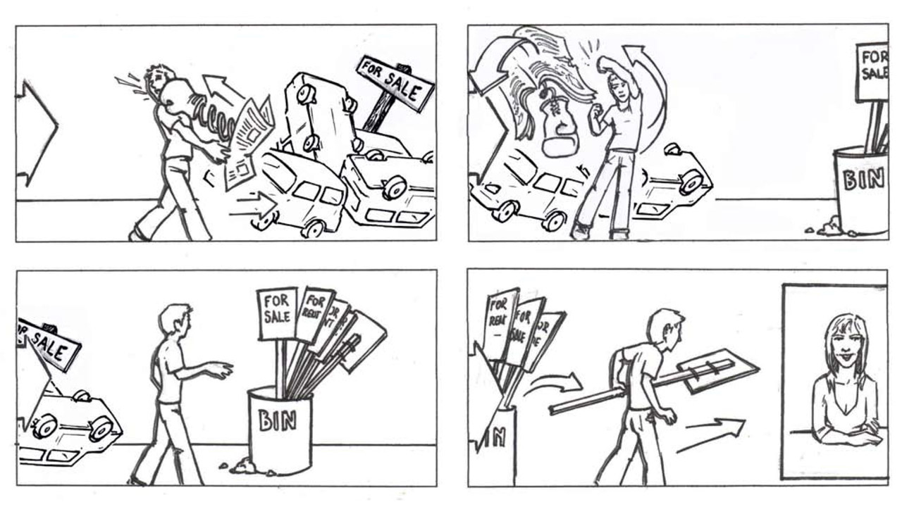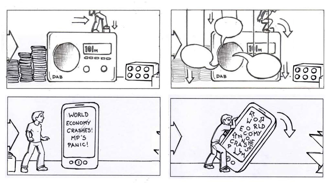 We shot one sequence with Russell in an empty white studio. Designed and printed out other elements (speech bubbles, logo sandwich board, arrows, newspapers etc) along with the selected stills of the shoot with Russell. Mounted it all up onto foam board. Rented some props, some lights and lenses. Made a tabletop white cove with some white formica. Shot it over a non-stop period of 2 days. We then took the rushes into After Effects and tidied them up, tweaked colours and levels. Got a rough cut signed off by the client. Began the lengthly task of retouching and incorporating additional CGI props. Composited it altogether. Gave it all a final grade.
