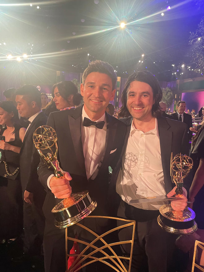 Oliver Latta (left) and Teddy Blanks hold their Emmy Awards at the Primetime Creative Arts Emmy Awards in September 2022 at the Microsoft Theater in Los Angeles, California.