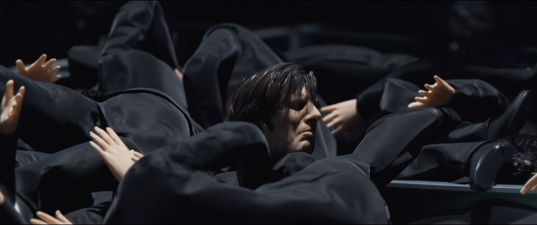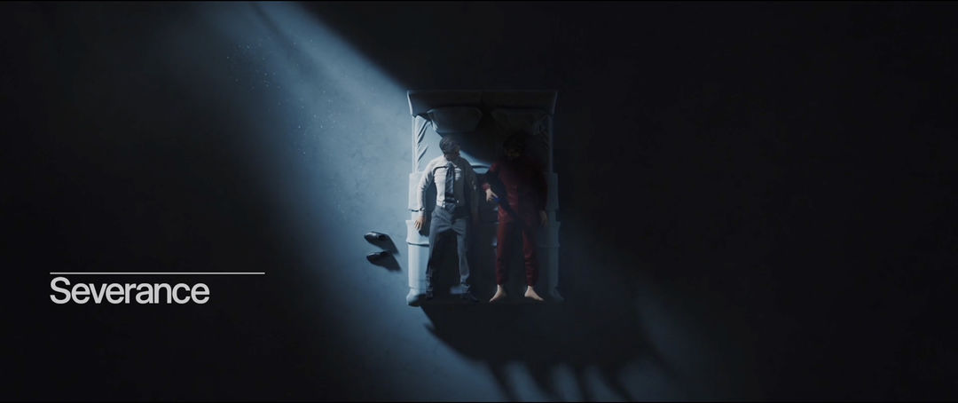 Still from the Severance title sequence showing the Mark Scout "innie" character passing by the "outie" character carrying a balloon made of bodies