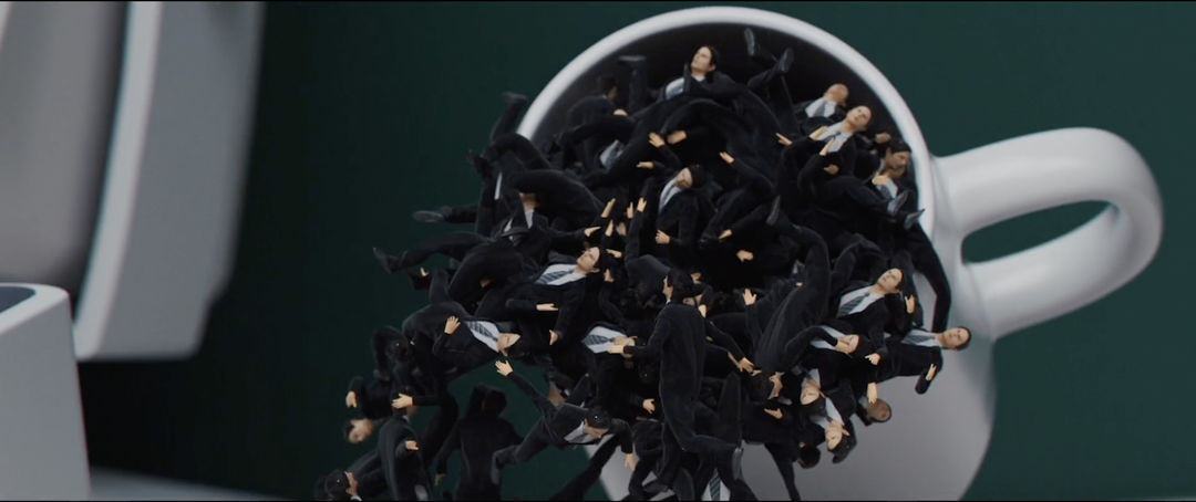 Still from the Severance title sequence showing many small bodies in suits falling out of a coffee cup