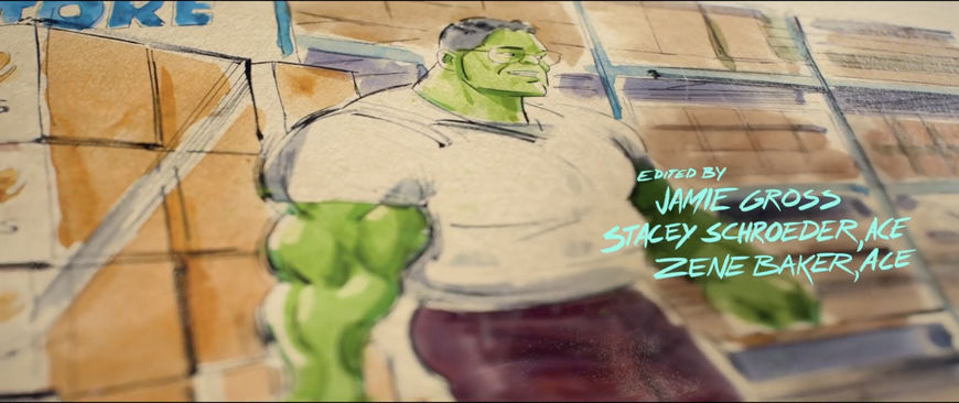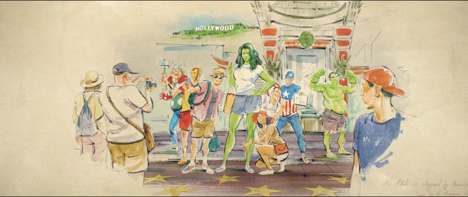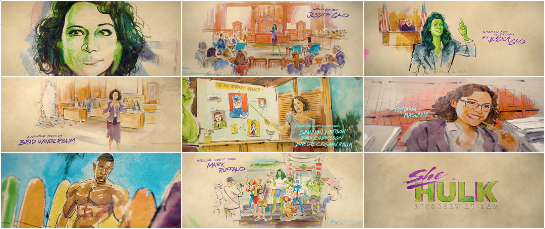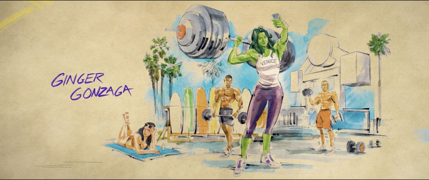 The main-on-end title sequence of the show, created by studio Aspect with illustrations by Toronto-based artist Kagan McLeod, takes the form of vibrant courtroom sketches that seem to paint themselves. The scenes aren’t moments from the show but rather a bonus, scenes that happen outside of the scripted episodes. The vivid drawings show Jen/She-Hulk and her cousin the Hulk, as played by guest star Mark Ruffalo, shopping for spandex and cheese puffs in bulk, discussing the relationship history of certain Avengers, and generally going about their larger-than-lives. As the Aspect team and McLeod discuss below, arriving at this illustration style and creating unique drawings for each episode’s ending proved to be no mean feat.