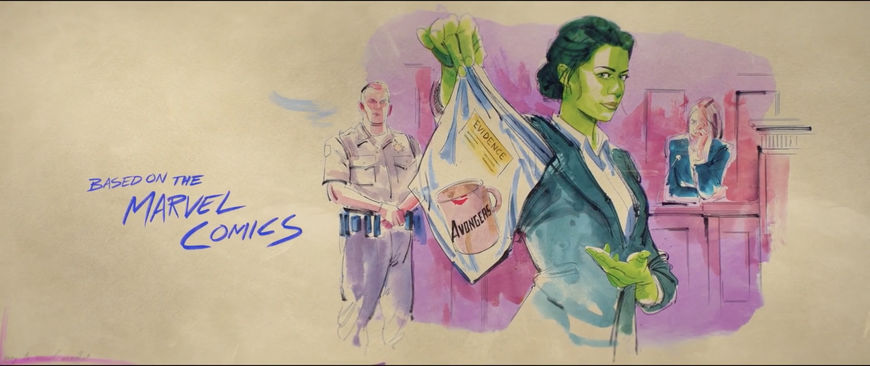 Still from the title sequence featuring the credit for “Based on the Marvel Comics” and Jen Walters holding counterfeit "Avongers" merchandise