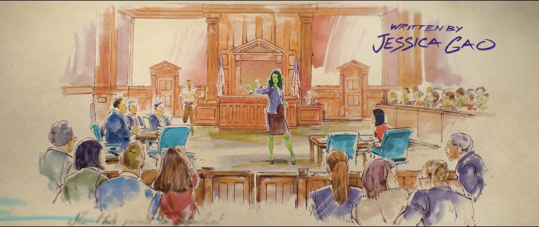Still from the title sequence featuring the credit for “Written by Jessica Gao” and She-Hulk standing in a courtroom