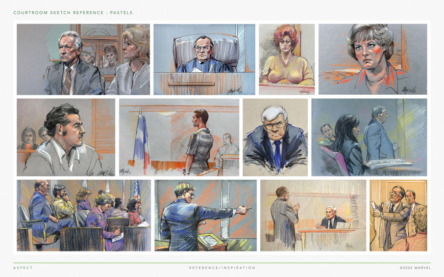 James designed these frames but the client felt like it was starting to veer into a concept art aesthetic as opposed to being firmly anchored in courtroom sketches. So we did start to gather references and we showed them different mood boards.