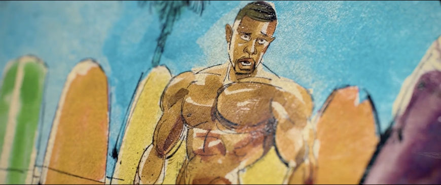 Nolan: Right. Kagan and I came in with some calligraphy-type writing. We had pitched that in one of the motion tests to sell them on getting it into Kagan’s style, the courtroom sketch thing. I think it did help to eventually persuade them towards the finished piece.