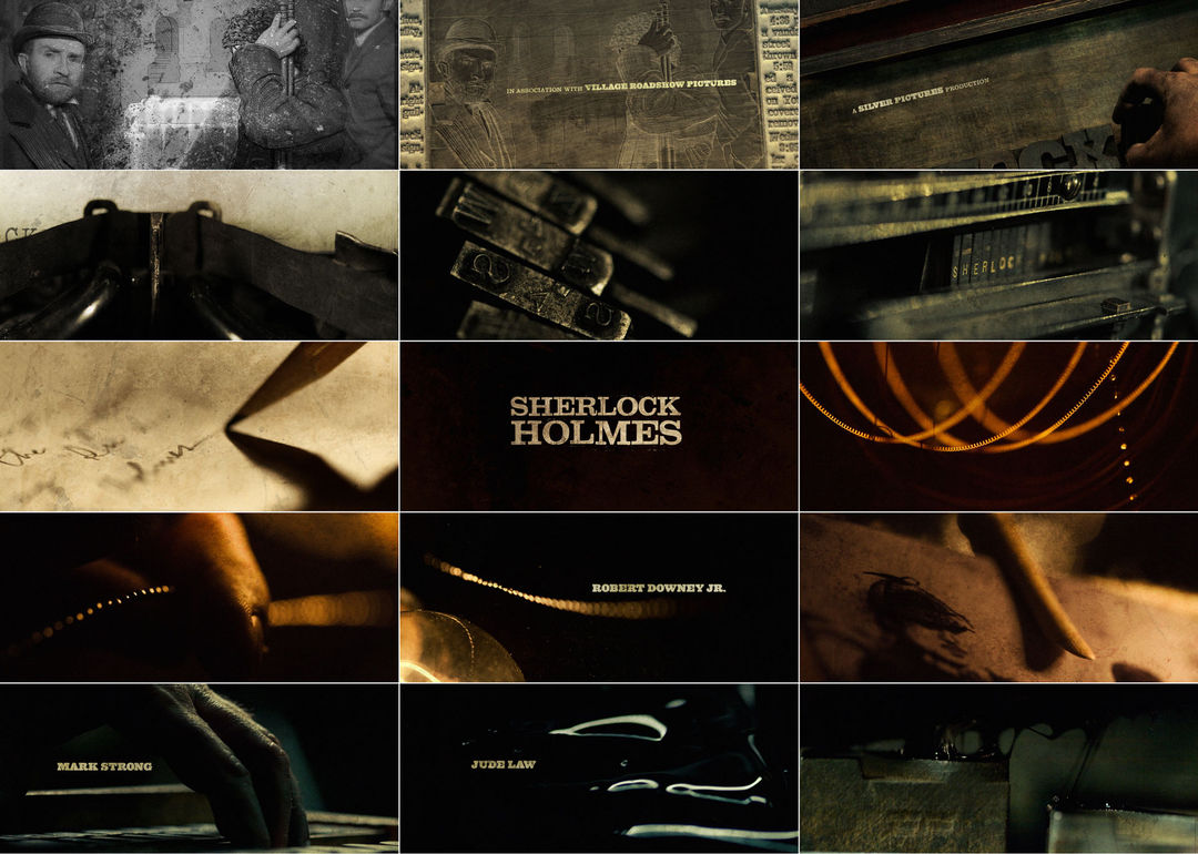 Watery cobblestone logos and longitudinal linotype layer, lace, and lash Prologue Films’ opening title and main-on-end credit work for Guy Ritchie’s Sherlock Holmes.
