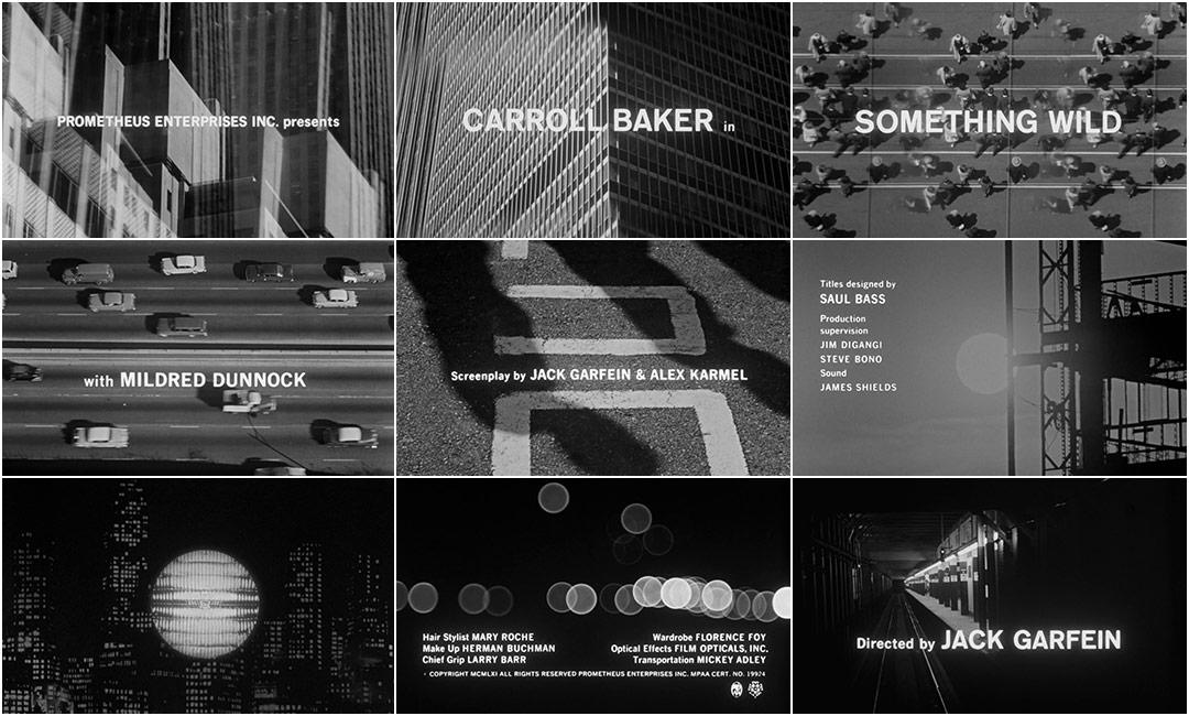 SUPPLEMENTARY: Something Wild (1961) end title card Credits Title Designers: Saul Bass, Elaine Bass (uncredited) Music: Aaron Copland Support Art of the TItle Related Edge of the City summary North by Northwest summary Ocean’s Eleven summary Metropolis summary I Wake Up Screaming summary Something Wild title only