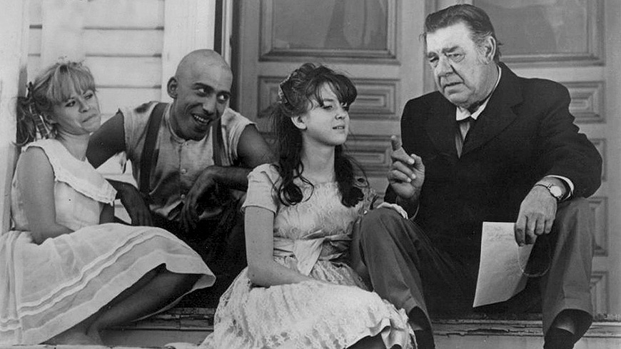 Spider Baby's main cast: Beverly Washburn, Sid Haig, Jill Banner, and Lon Chaney Jr. (left to right)