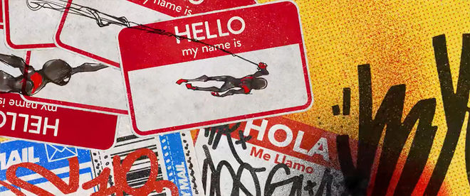 Some specific moments, however, did incorporate truly analog illustrations. There is a section about two-thirds into the sequence that uses a series of “HELLO, MY NAME IS…” stickers to create a cel-animated effect of Miles swinging through the scene. We wanted it to look like Miles had drawn a sequence of an animation on these stickers and they would appear to animate as he threw up each subsequent tag. This was where we collaborated with Eric Hibbeler. Eric showed us a variety of stylistic test drawings.