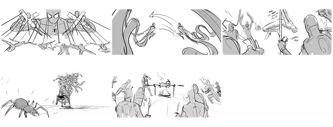 The second example is in the wallet section. There’s a moment where the camera travels past a wallet that Spider-Man’s holding and an accordion-style sleeve of photos falls out, as though they’re funny memories that he carries around. We were inspired by awkward family photos and created a series of funny moments with multiple Spider-Men posing together.