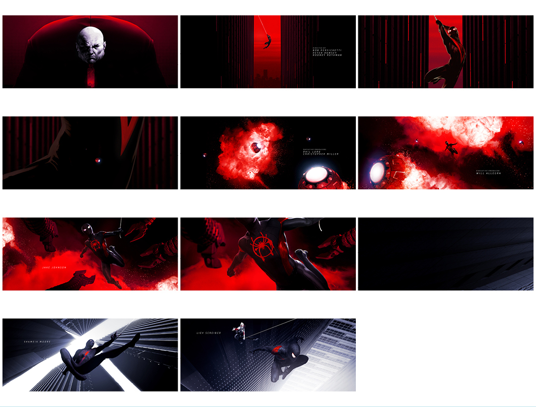 Brian: We also designed custom cards to tailor the typographic style of each credit to its corresponding scene, so for example Spider-Noir’s scenes would have a black-and-white 1930s look while scenes with Miles would use spray-painted stencils. The filmmakers loved it and told us to move full-speed ahead.