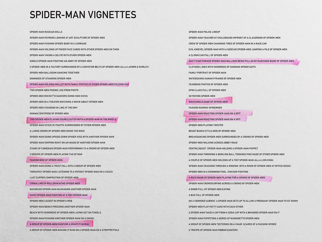 Brian: Inspirational and intimidating. We met at Sony Animation and entered one of their conference rooms. An army of people started to pour in: Phil Lord, Christopher Miller, Peter Ramsey, Rodney Rothman, Bob Persichetti, Christina Steinberg, Will Allegra, and a collection of producers and collaborators. They walked us through the background and the basic plot. We looked at concept art, character designs and a few preliminary animated scenes. The brief was open and there were a lot of themes to leverage: an aesthetic inspired by comics, the infinite range of Spider-centric characters, the multiple dimensions... We were blown away and left with a high level of enthusiasm but we were bewildered as to how we could make something that could follow such an amazing film. They gave us a draft of a script, which was missing an ending but would give us a jumping-off point.