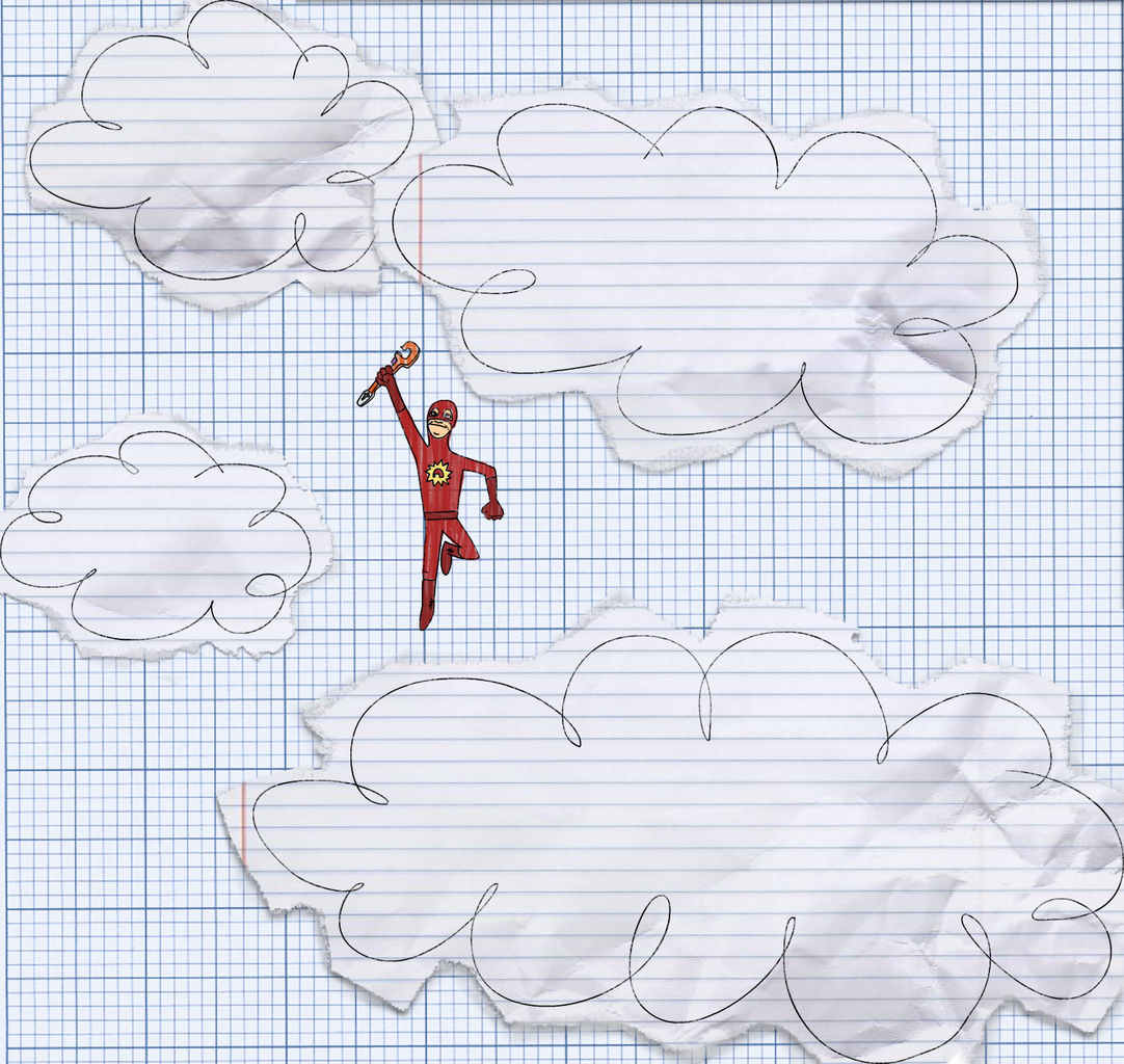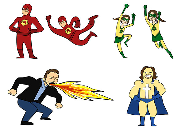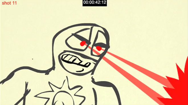 For Super, the music track already existed, a song James loved, so the slate wasn't completely blank. But I still determined the frames per beat and animated a visual beat as a guide (a red X for each beat). Once I have this visual beat as a reference I can start establishing the broad actions and mood of the story that James wanted to tell in this sequence. Crimson Bolt flies up through the clouds for 16 beats, holds heroic pose for 4 beats, 1 beat of anticipation to start flying again, and 4 beats to fly forward until his chest logo fills the screen, etc. When working with a locked music track, there will be obvious breaks and strong beats that help determine big changes in action and story. I used the high energy tempo and strong beats in the Super sequence to introduce the character roles, the intense/comic violence and the synchronised dance steps. I drew from my musical theater experience and watched a lot of musicals when this project began to help choreograph the dance moves, something I've always wanted to do in my animation career.