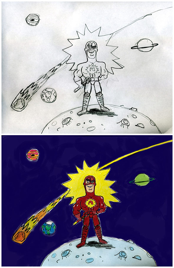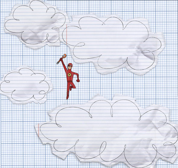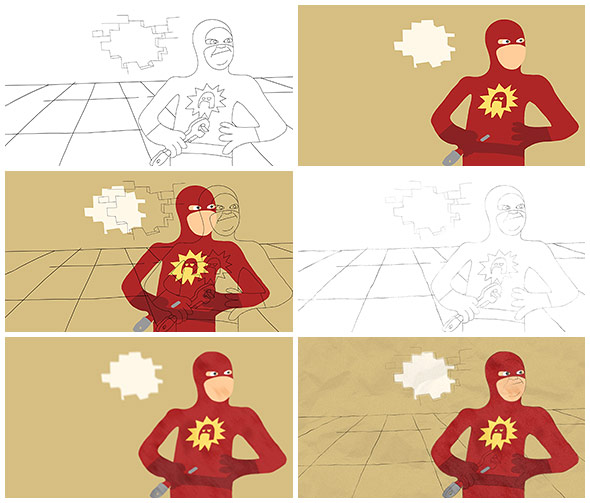 The animation is all hand-drawn but on computer tablets. In this case we animated a line layer and a separate color layer to add some After Effects filters to give it an on-paper look. We had to make some decisions early on about how we were going to use paper, do we pan across pages taped together...or use paper cut out clouds and rocks? It started looking a bit too crafty so we stuck to a mostly locked shot with different paper textures. Most of the color was done in Flash with an After-Effects noise added but to get the crayon or colored pencil look of some of the backgrounds we used custom brushes in Photoshop. Victor composited it all together using After Effects. We logged 1625 hours on Super all together.