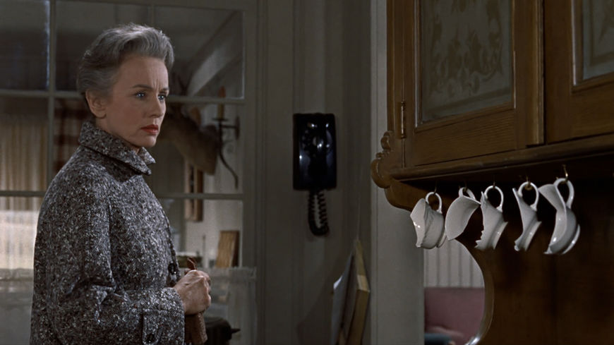 Still from The Birds featuring Jessica Tandy (Lydia Brenner) noticing a row of broken teacups in the Fawcett kitchen
