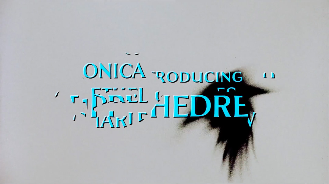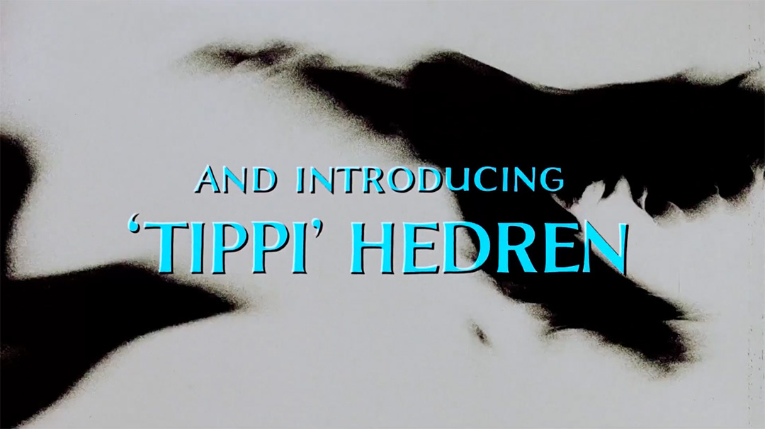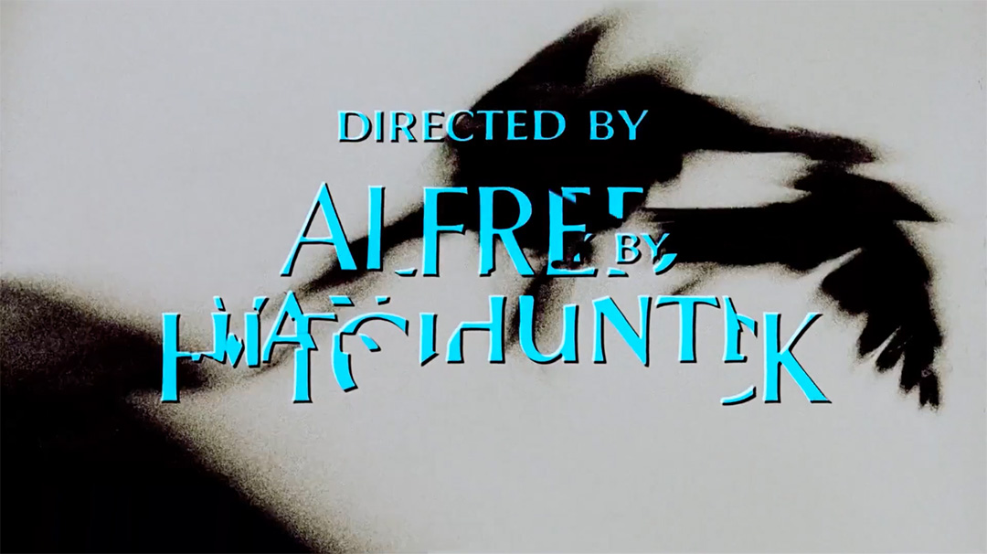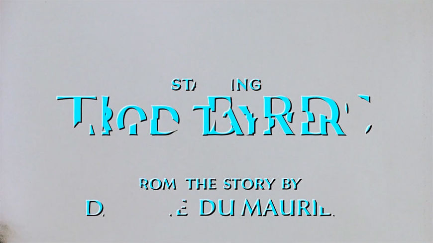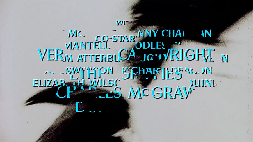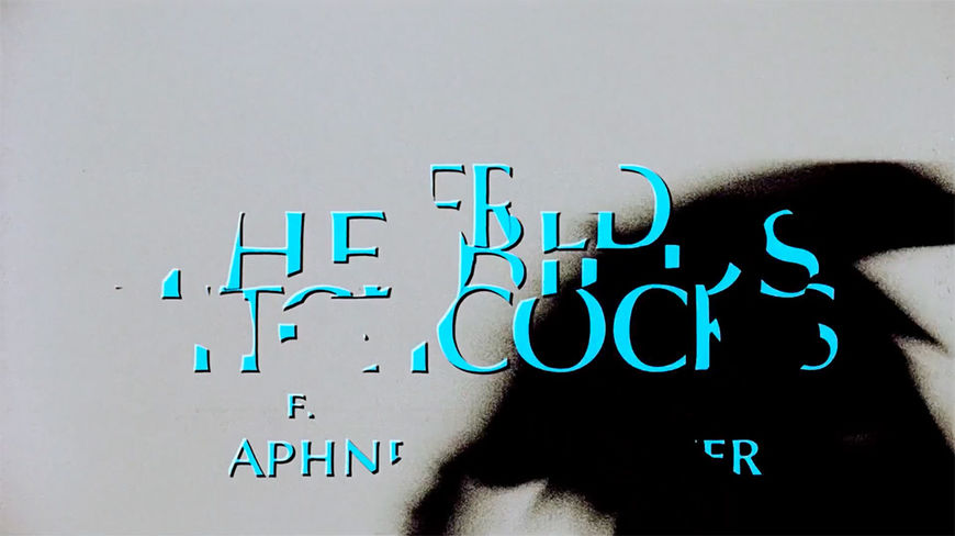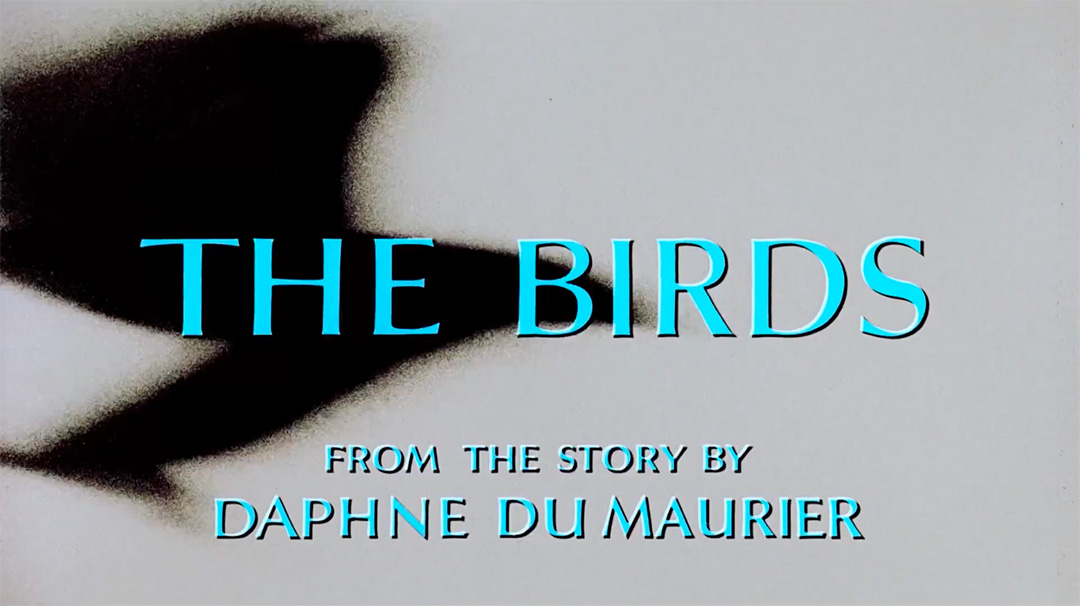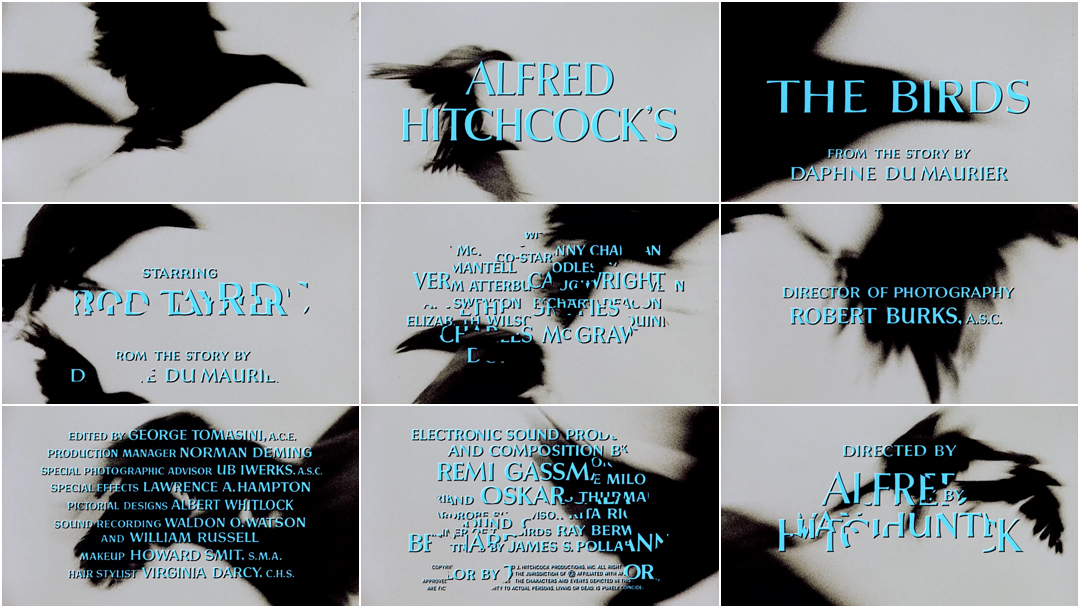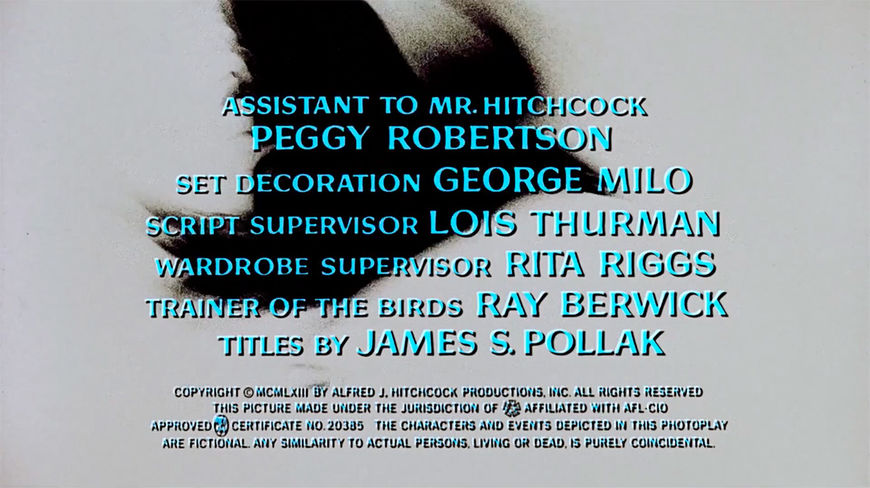 Stills from the main titles of The Birds (1963) featuring credits for Alfred Hitchcock's assistant Peggy Robertson and title designer James S. Pollak