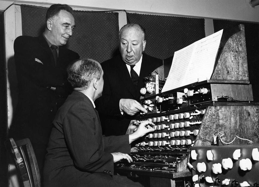 Sounds effects producers and composers Remi Gassmann and Oskar Sala work on the sound for The Birds at a MixturTrautonium synthesizer alongside Director Alfred Hitchcock