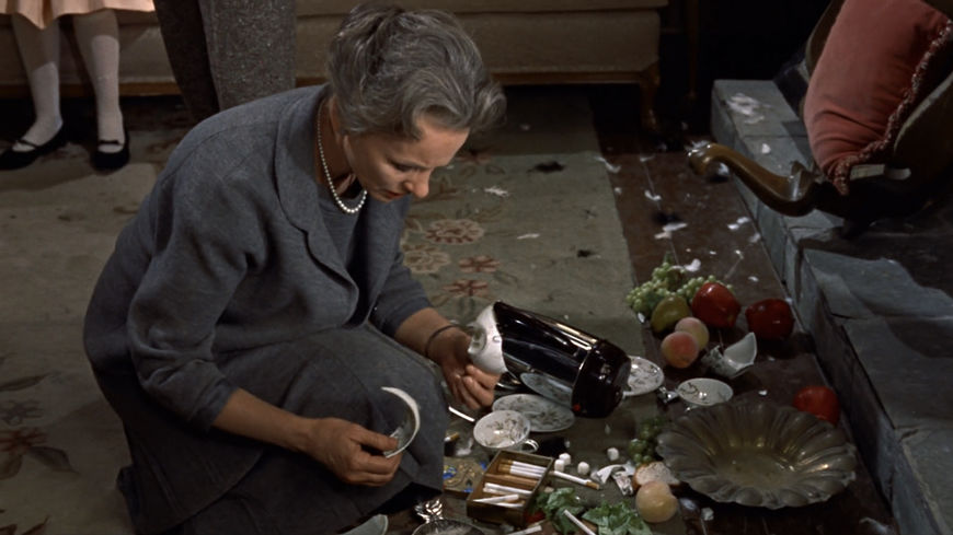 Still from The Birds featuring Jessica Tandy as Lydia Brenner clearing away broken teacups after a bird attack in the Brennan living room