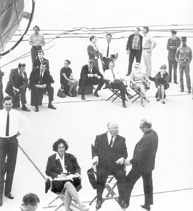 "We sat alone in the screening room, side by side, Hitch and I, watching the opening credits of the film. He had decided by then that there would be no score for The Birds. Unmindful of his artistic pretensions for the film, I told him I thought that would be a mistake; that music could subtly foreshadow dire events to come or stridently accompany bird attacks until we had the audience screaming. He said no. No music. The titles had no music behind them. The screen was filled with fuzzy images of flying birds. There was the sound of wings whirring. There was the sound of birds squeaking and eeking. It was all very scary and portentous. Maybe he was right."