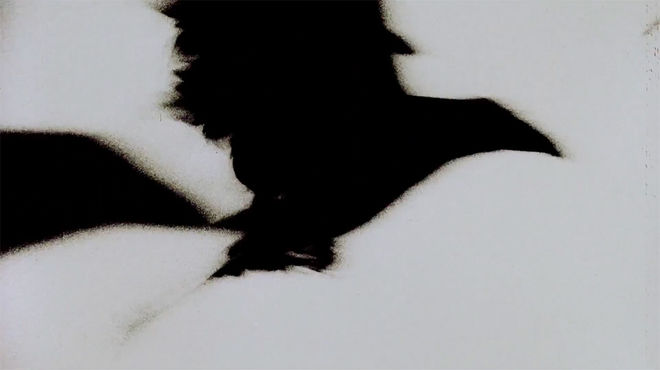 The credits, executed in the blue of a perfect clear sky, are torn to pieces as if pecked apart.