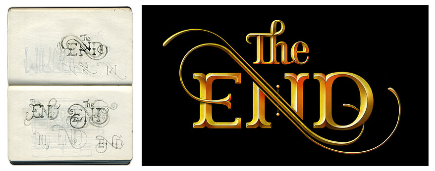 Sketches and final design of the “The End” title card for Mirror Mirror