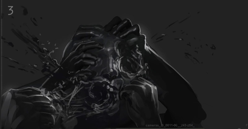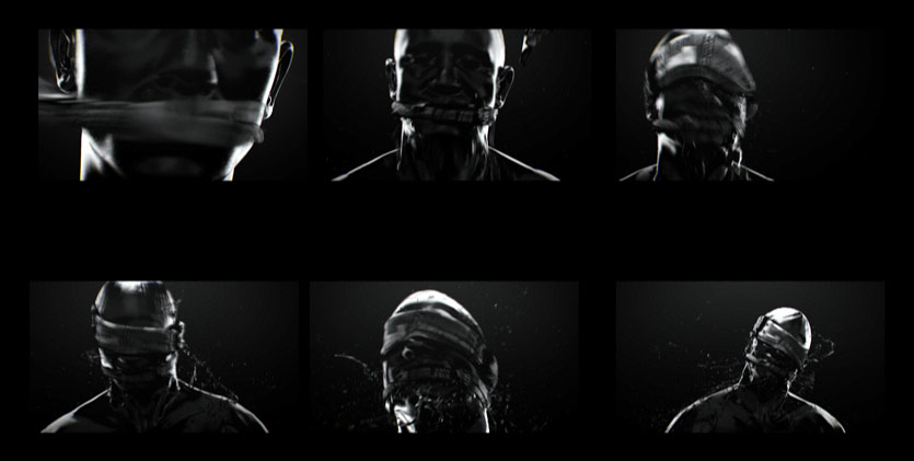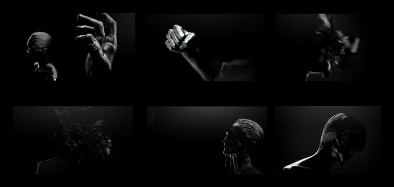 But in others the liquid is more integral to the concept, like the “hot hands” that melt her face or the head being ripped apart or the last one, the vignette where she digs herself out of the ground. We wanted dirt to be floating on top of liquid and then have Lisbeth covered in it. All of those stacked elements get pretty complicated from a fluid simulation standpoint.