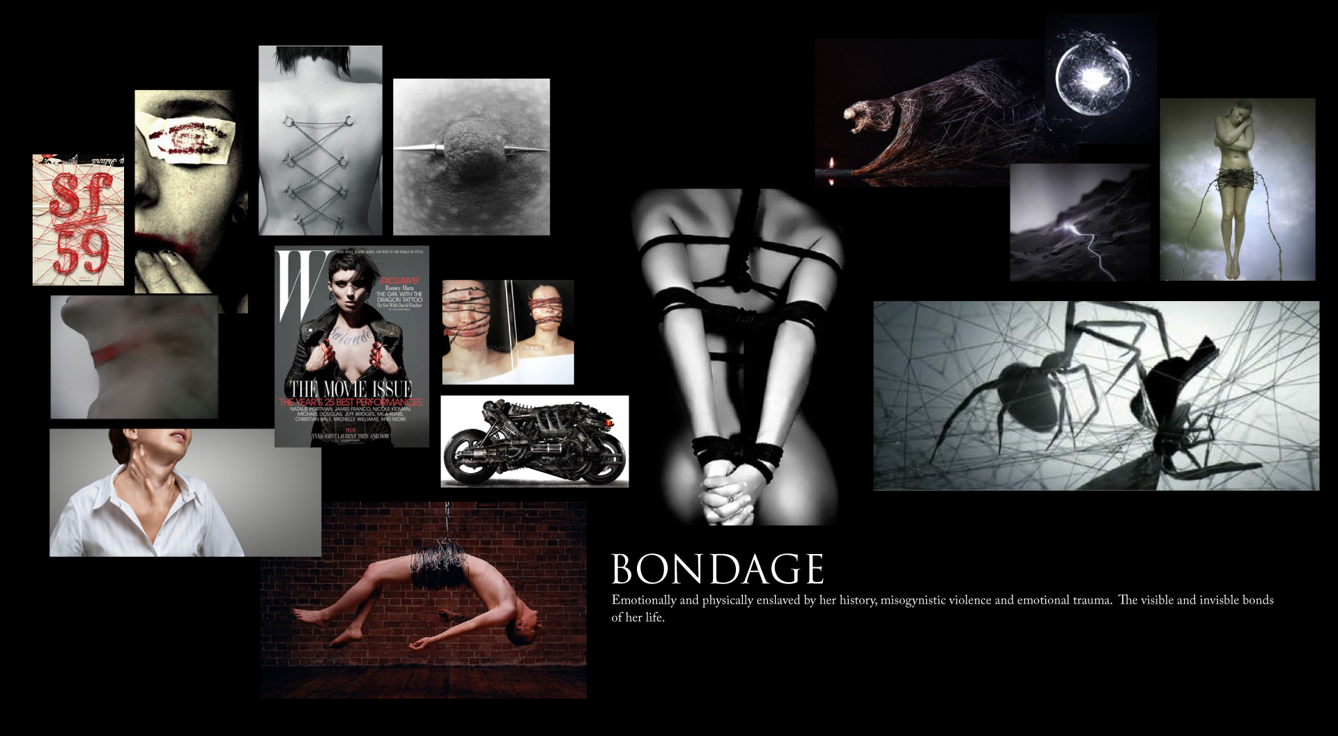 TM: We just didn’t find anybody that we all liked. So we gathered a giant batch of reference that had the right kind of feel and we sent it to David. He circled in on this black-on-black look with lots of fluids and said, ‘Yes, that’ll work – it’s like a nightmare of Lisbeth’s.’