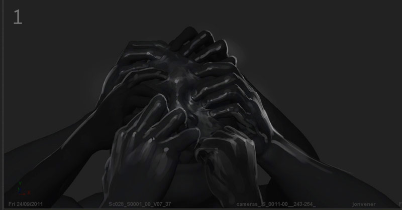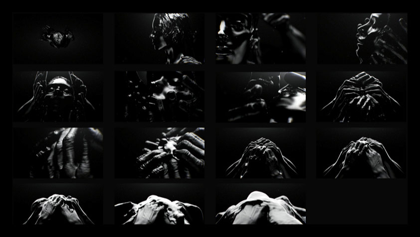 So we did our best to set up a creative and production process with lots of flexibility. For instance, we created most of the scenes in a sort of void, as “theatre in the round.” An example of that is the “hot hands” vignette where the fingers come up and grab her face and melt it; we didn’t initially plan out exactly where the camera should be for every shot. We put the action together and then watched it from tons of camera views to find the best angles and cuts.
