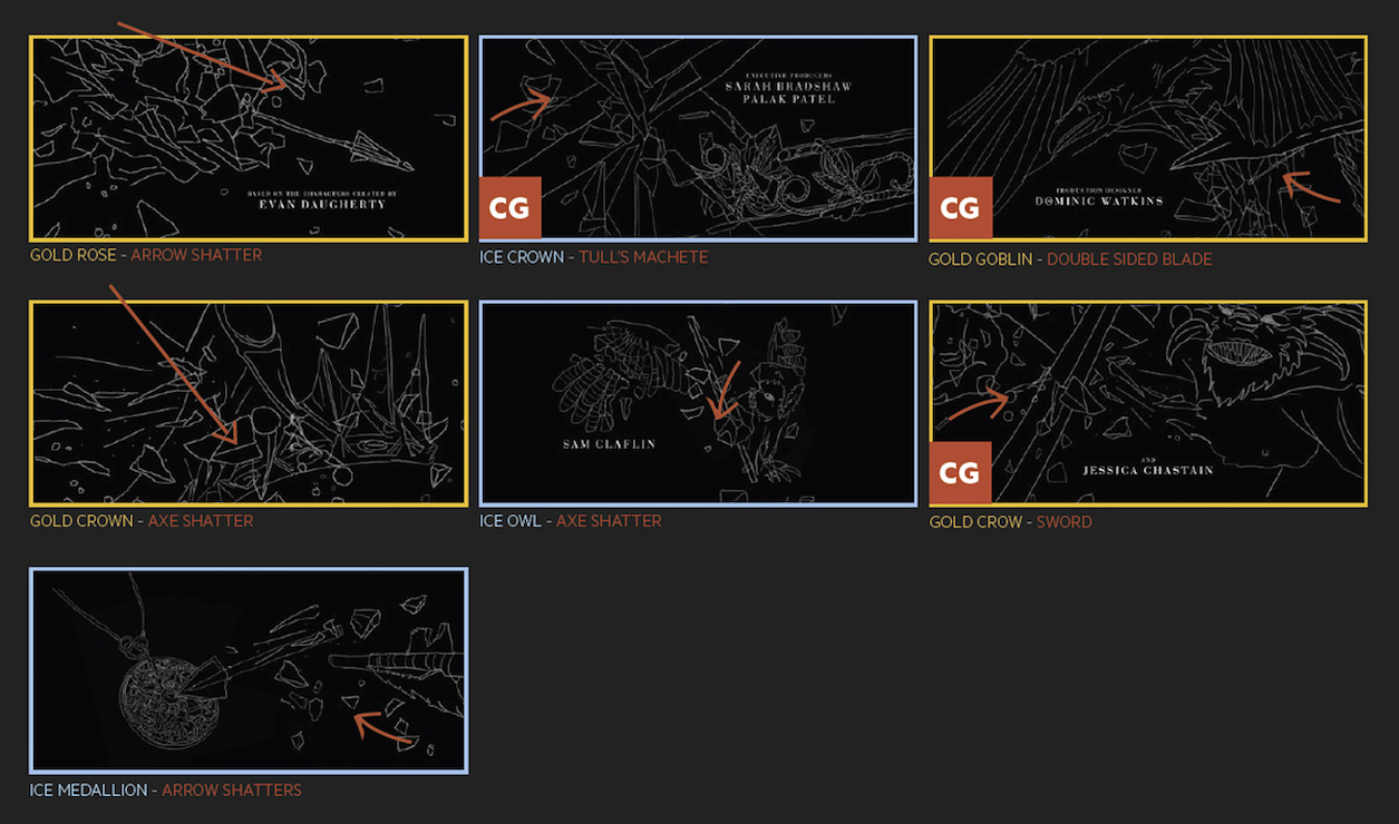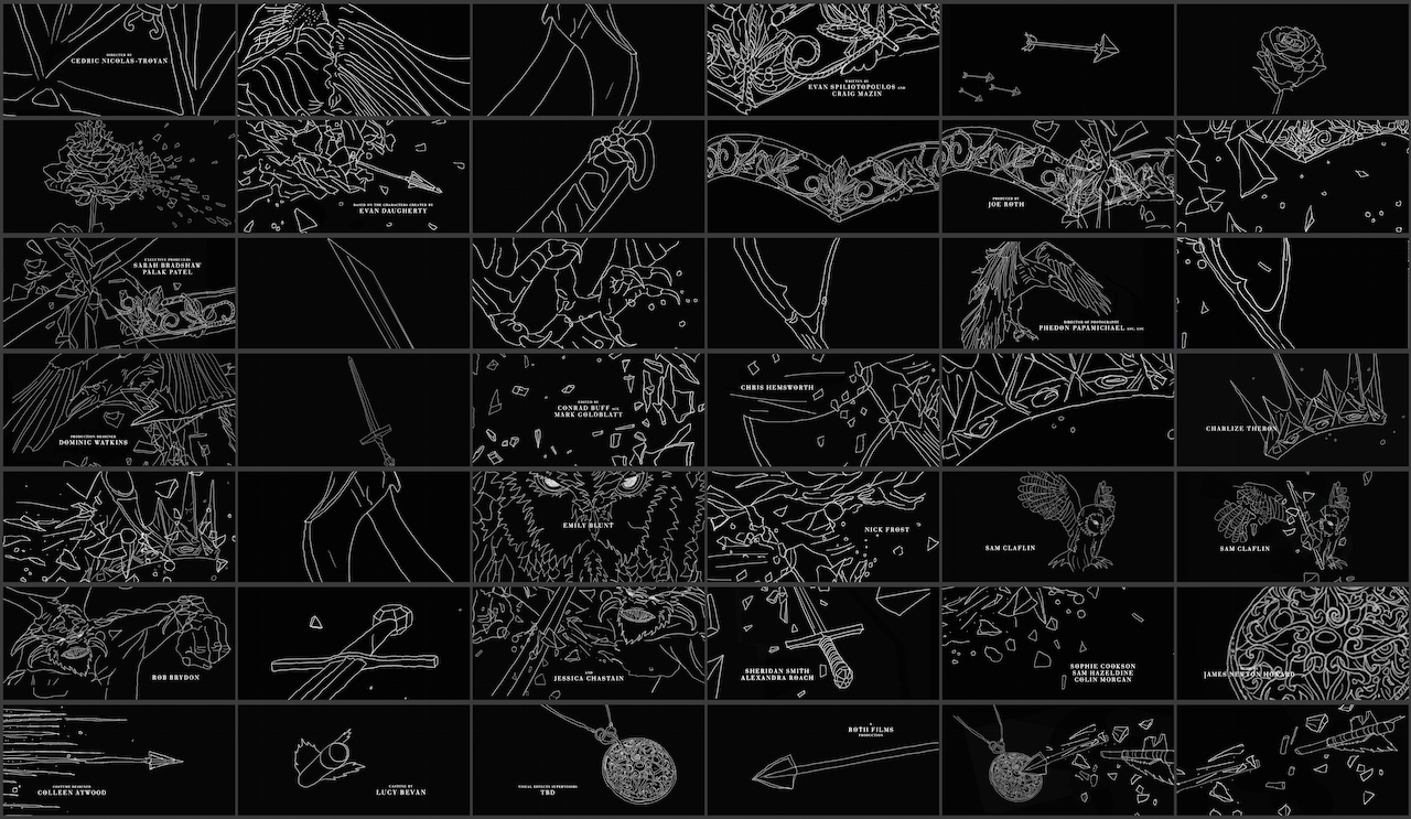 The film is both prequel and sequel to 2012’s Snow White and The Huntsman and follows closely in its title design footsteps. In Winter’s War, the end title sequence acts as farewell to a fight that sees powerful sisters – Charlize Theron as Ravenna, the Evil Queen, and Emily Blunt as Freya, the Ice Queen – wage a war of gold and frost, sword and sickle. Featuring the song “Castle” by American singer Halsey, and the destruction of crowns, flowers, beasts, and birds meticulously carved from ice, the sororal bonds once forged are shattered into a thousand pieces.