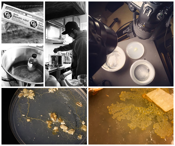 So I found some slime mould stuff and some YouTube videos and hacked something together. Within three days we had our foundation. Then, we needed to grow the slime mould and take on that challenge. The whole beginning was a week and a half of growing mould – it grows pretty fast, especially under ideal conditions – and I had two or three timelapse cameras running on it at all times. I ended up taking it to my house and growing some there with my wife watching the cameras. We shot everything camera raw so that we had the most to work with. By the end of those two weeks I had a pretty severe cold, I think from all the spores and slime moulds, but it had to get done.