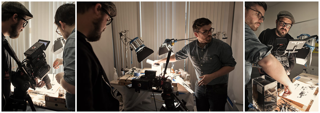KJ: The first test was done with the 100mm macro Canon lens – the 5D Mark III, a pretty typical Canon lens – and then a Zeiss manual 100mm macro. It was just not small enough to capture the world, though. We couldn’t get enough detail to make it shallow enough to be artistic and cool and shallow enough to hide the fact that we are trying get away with doing ink on paper. The second test came a day and a half before Henry and I were going to get together – I had the Epic on site, I had both the 100mm macros in my arsenal – but it just was not working.
