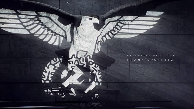 The first sounds are of a film projector starting, and the sequence presents a number of images with the flickering and uneven style of projected celluloid. We move over a map of North America as monuments have combat footage projected on and through them. Lady Liberty, Joan of Arc, and the eagle blend together effortlessly to establish believable Nazi–American iconography. The map-making imagery is also fascinating here, recounting the outcome of World War II using the visual language borrowed from numerous war movies, showing lines moving on maps and the shifting lines of power.
