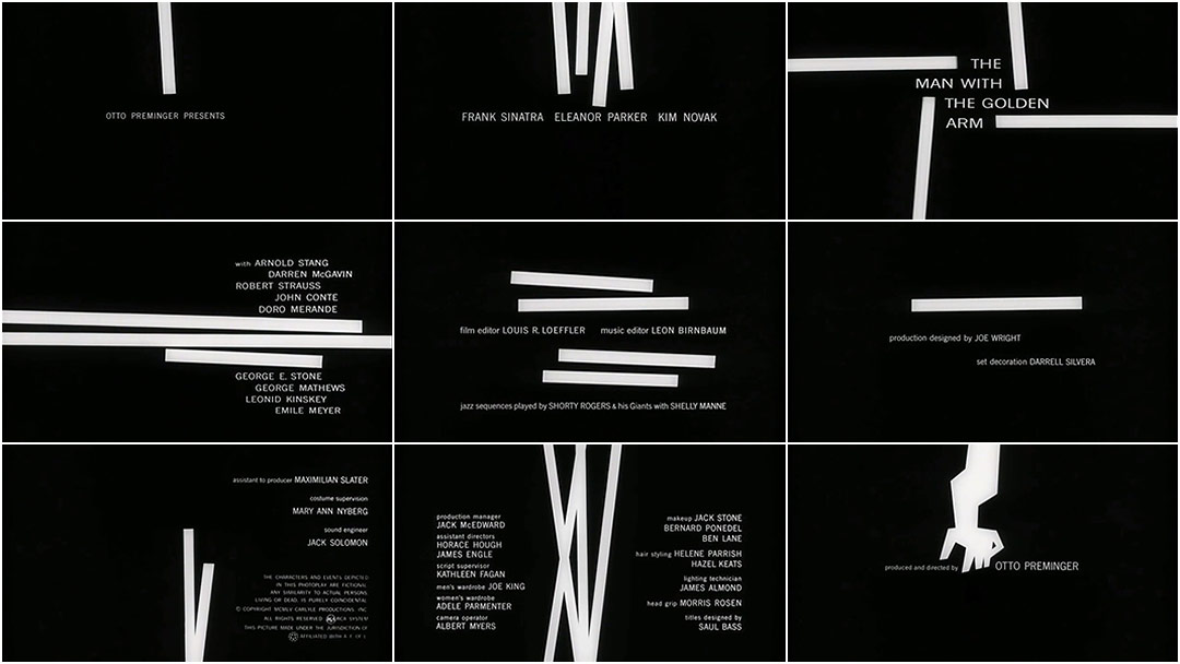 Accompanied by Elmer Bernstein's driving jazz-like score, and set against a black background, white bars appear, disappear and form abstract patterns before finally coalescing into the film's symbol. Contrasts between the black and white heighten the strident intensity, and the disjunctures encapsulate the mood of the main character, a downbeat drummer with a penchant for gambling and drugs. Because of the extremely tight schedule, Bernstein had to compose the music at the same time as Saul was creating the title. Saul explained, “He gave me a beat, 'the counts' as we say, and I designed to that beat. It was a helluva moment when we first screened it.”