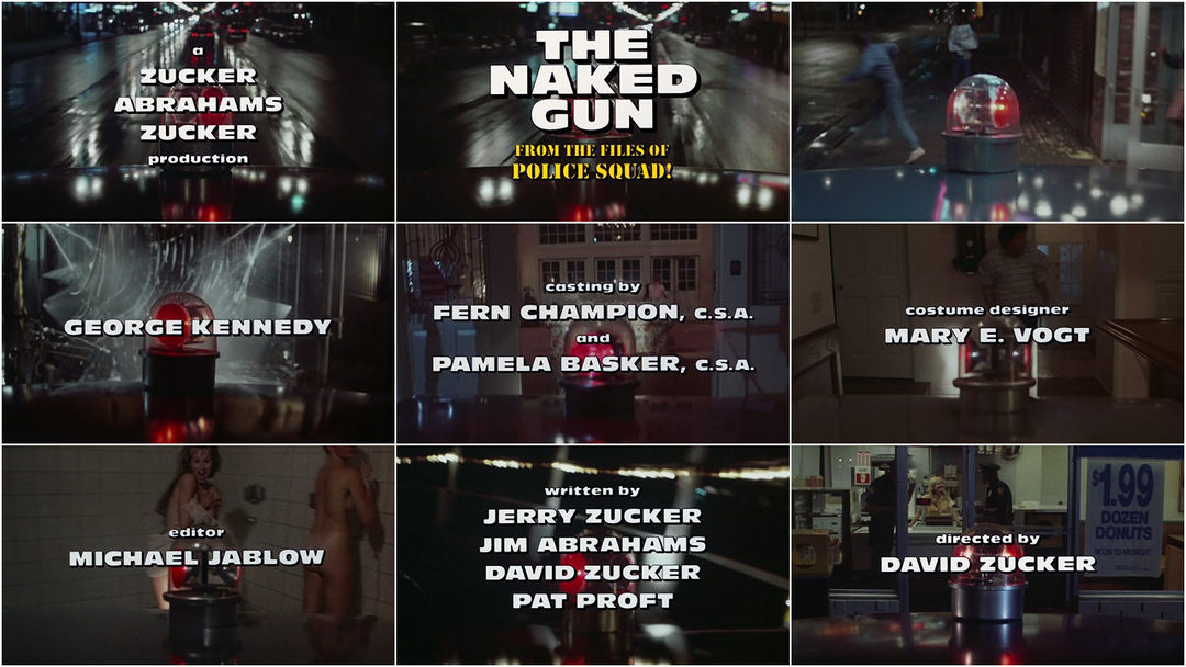 The typefaces, chosen and laid out by title designer Douy Swofford, are Stencil (for the title) and Antique Olive (for the credits). By now they are iconic, immediately recognizable as part of the brand of the Naked Gun franchise. As the sequence finishes, the siren screaming its way down a rollercoaster, by now a disembodied character in its own right, we know exactly what to expect from the following film: a hilarious ride of unreal proportions.
